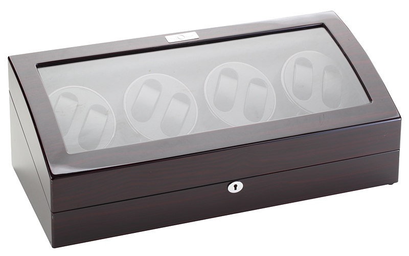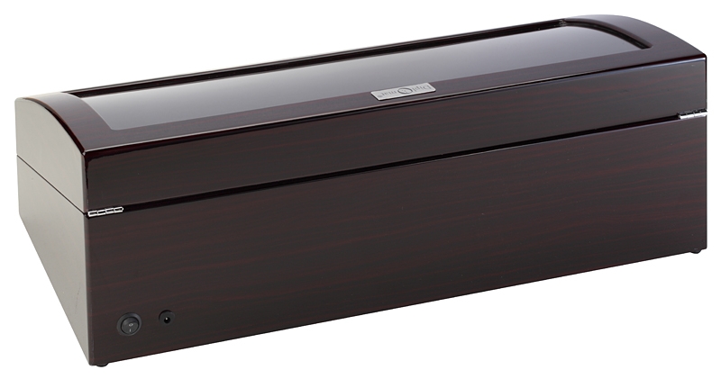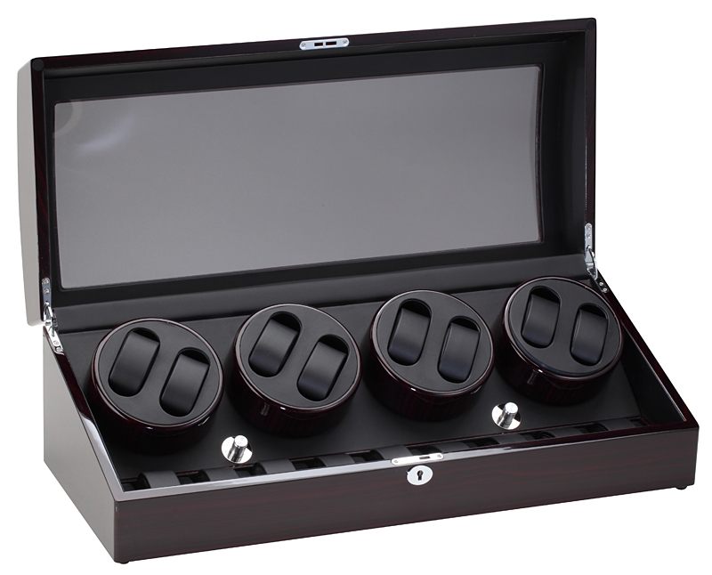 This Diplomat Gothica 31-428 ebony eight watch winder will make your favorite timepieces ready to wear anytime. It is powered by a very silent Japanese Mabuchi motor that features four programmed settings (650, 900, 1350, or 1800 TPD) which prevents the winder from over-winding or straining the internal mechanisms of the watch. The four programmed timer settings are: (1) The turntable will rotate clockwise for one minute, then rest of 20 minutes, then repeat; which provides a total of 650 TPD; (2) The turntable will rotate counter-clockwise for two minutes, then rest of 28 minutes, then repeat; which provides a total of 900 TPD; (3) The turntable will rotate counter-clockwise for 3 minutes then rest for 27 minutes, then the turntable will rotate clockwise for 3 minutes then rest for 27 minutes, then repeat; which provides a total of 1350 TPD; (4) The turntable will rotate clockwise for 10 minutes then rotate counter-clockwise for 10 minutes (this will repeat for 1 hour), then rest for seven hours, then repeat; which provides a total of 1800 TPD.