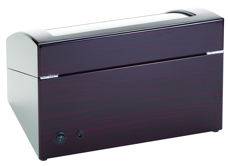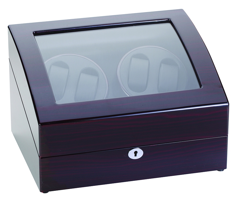 This Diplomat Gothica 31-426 ebony quad watch winder will make your favorite timepieces ready to wear anytime. It is powered by a very silent Japanese Mabuchi motor that features four programmed settings (650, 900, 1350, or 1800 TPD) which prevents the winder from over-winding or straining the internal mechanisms of the watch. The four programmed timer settings are: (1) The turntable will rotate clockwise for one minute, then rest of 20 minutes, then repeat; which provides a total of 650 TPD; (2) The turntable will rotate counter-clockwise for two minutes, then rest of 28 minutes, then repeat; which provides a total of 900 TPD; (3) The turntable will rotate counter-clockwise for 3 minutes then rest for 27 minutes, then the turntable will rotate clockwise for 3 minutes then rest for 27 minutes, then repeat; which provides a total of 1350 TPD; (4) The turntable will rotate clockwise for 10 minutes then rotate counter-clockwise for 10 minutes (this will repeat for 1 hour), then rest for seven hours, then repeat; which provides a total of 1800 TPD.