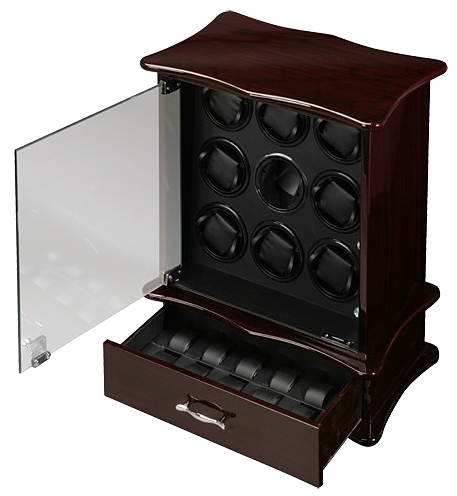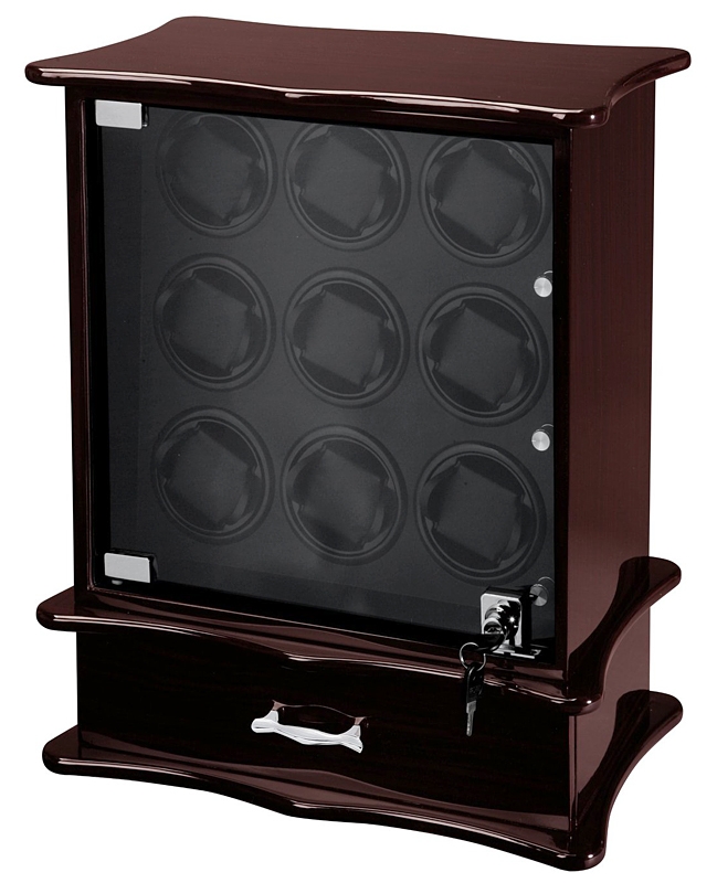 This Diplomat Gothica 31-429 ebony nine watch winder cabinet will make your favorite timepieces ready to wear anytime. It is powered by a very silent Japanese Mabuchi motor that features four programmed settings (650, 900, 1350, or 1800 TPD) which prevents the winder from over-winding or straining the internal mechanisms of the watch. The four programmed timer settings are: (1) The turntable will rotate clockwise for one minute, then rest of 20 minutes, then repeat; which provides a total of 650 TPD; (2) The turntable will rotate counter-clockwise for two minutes, then rest of 28 minutes, then repeat; which provides a total of 900 TPD; (3) The turntable will rotate counter-clockwise for 3 minutes then rest for 27 minutes, then the turntable will rotate clockwise for 3 minutes then rest for 27 minutes, then repeat; which provides a total of 1350 TPD; (4) The turntable will rotate clockwise for 10 minutes then rotate counter-clockwise for 10 minutes (this will repeat for 1 hour), then rest for seven hours, then repeat; which provides a total of 1800 TPD.