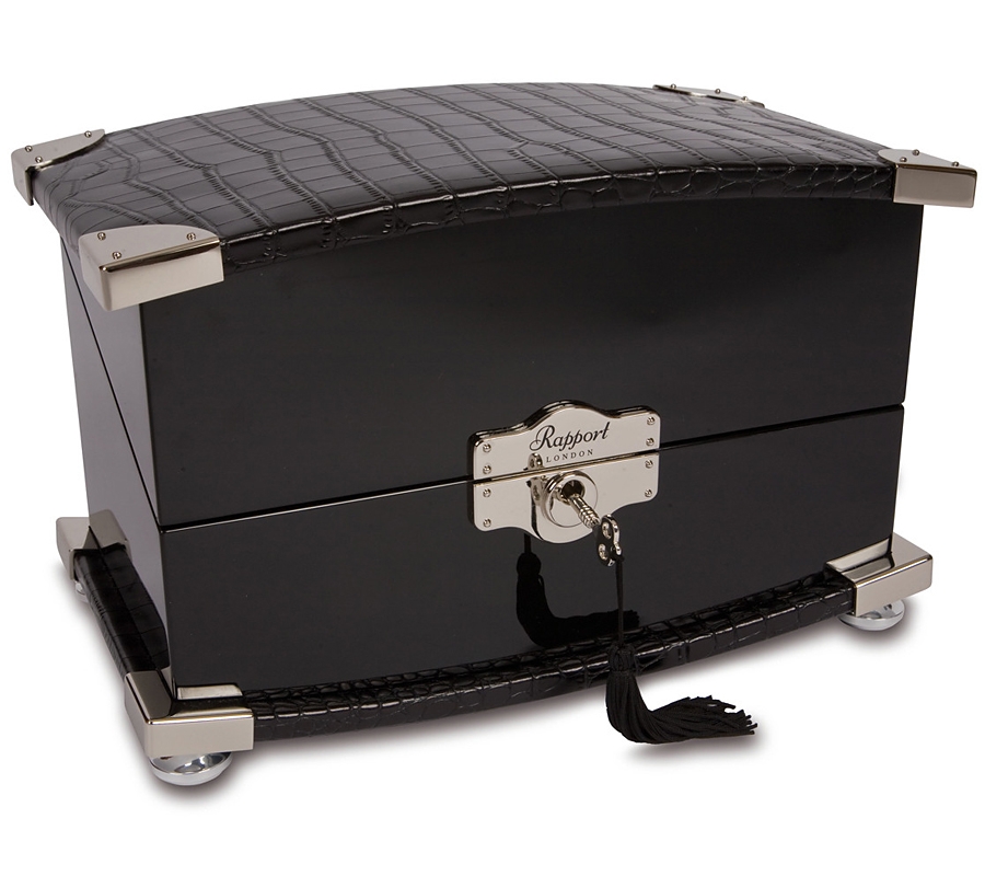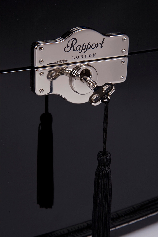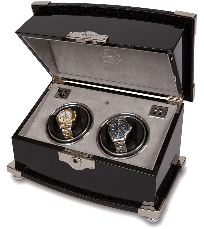 When you don't wear your automatic timepieces every day, this double watch winder W222 will keep them wound and ready for special occasions! It's a member of Optima Serpentine series produced by Rapport of London in United Kingdom. The box is masterly made of fine ebony wood veneer with high-gloss lacquered finish. The top features genuine black leather embossed with crocodile effect. The lid is also accented chrome plated protective corners. There is a decorative escutcheon plate closure to safely lock your valuables. The interior is lined with soft-feel gray velvet material. The watch holder is covered with black leather, and has adjustable soft clip that accommodates any length of watch band. This device is equipped with reliable motors that are completely programmable, and run virtually silent. There are control switches that offer to select between 2 speed rotation options (3960 or 1130-1690 turns per day) and 3 rotation directions (clockwise, counter-clockwise or bi-directional). It's powered with AC adapter or batteries. The case measures 13 inches in width, 8 1/2 inches in height and 7 1/2 inches in depth. This winding machine is designed with a touch of pure luxury! We're an official dealer of the brand. You get factory warranty and free domestic shipping for this item.