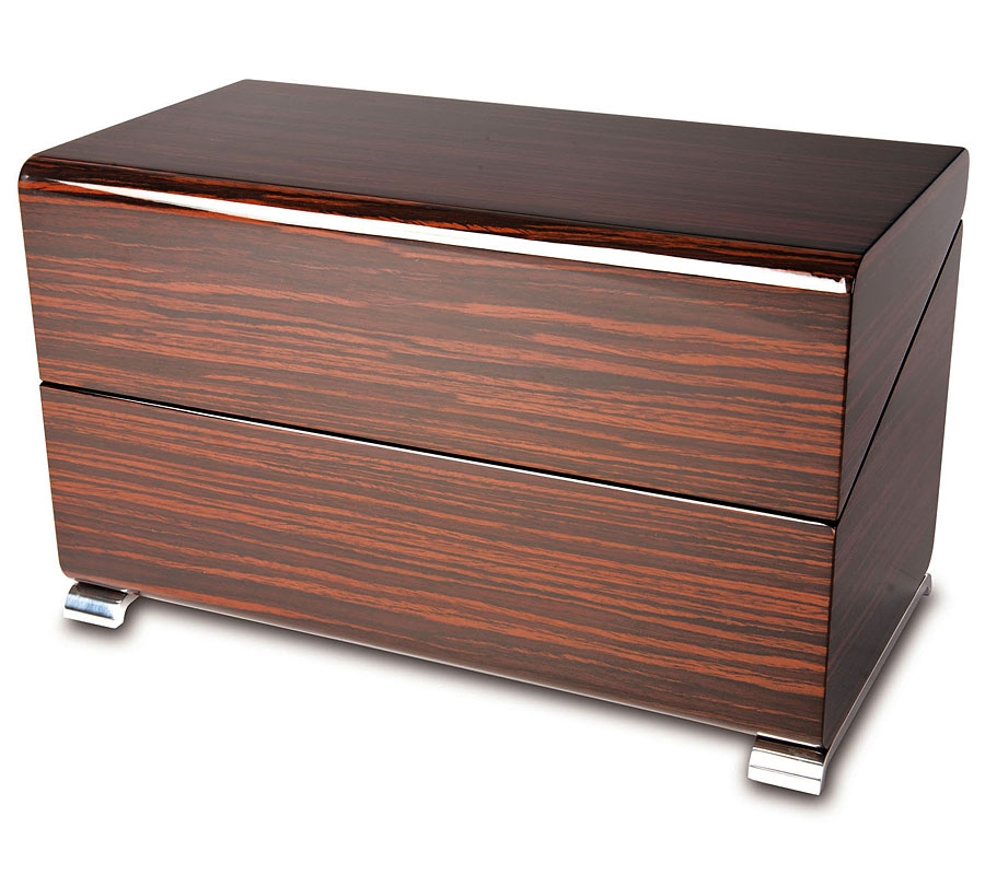 This double watch winder W342 will look amazing in your stylish room! It's a member of Vogue collection created by Rapport of London. The box is professionally made of solid wood with high-gloss lacquered Macassar finish. It features eight elegant rounded corners, and fitted with two chrome plated brass foot. The interior is lined with soft-feel gray velvet fabric. The watch holder is covered with black leather, and has adjustable soft clip that accommodates any length of watch band. This device is equipped with reliable motors that are completely programmable, and run virtually silent. There are control switches for each timepiece. They offer to select between 2 speed rotation options (3960 or 1130-1690 turns per day) and 3 rotation directions (clockwise, counter-clockwise or bi-directional). It's powered with AC adapter or optional batteries. The case measures 12.0 inches in width, 7.25 inches in height and 6.25 inches in depth. Chic solution for your two valuable self-winding watches! We're an official dealer of the brand. You get factory warranty and free domestic shipping for this item.