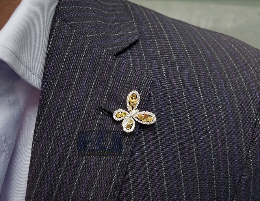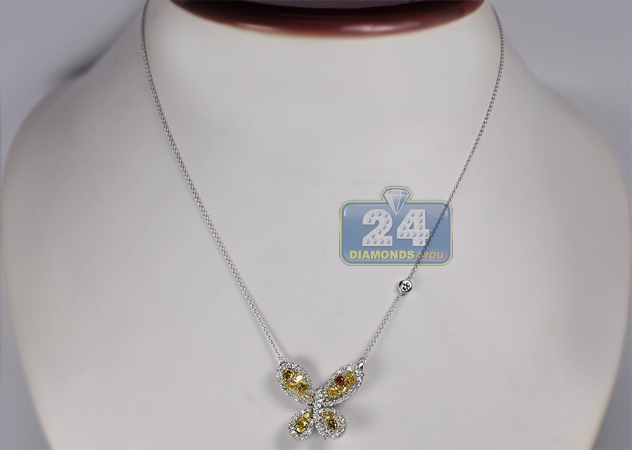 Here's an amazing piece of art featuring fancy diamond brooch that can be easily transformed into a butterfly necklace! Professionally made of cool 14k white gold, it is studded with natural not-enhanced fancy yellowish diamonds and icy white round brilliant-cut diamonds, all weighting 2.37 carats. The necklace measures 17 inches in length. Our women's breathtaking jewelry is a conversation starter!