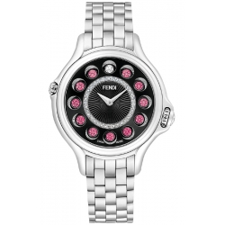 This Fendi Crazy Carats Watch F107031000D2T05 features 38.0 mm case made of stainless steel; black dial encrusted with 36 white diamonds; gemstone interchange of 33 white, pink and rainbow topazes; stainless steel bracelet with folding closure. The timepiece is equipped with Swiss quartz movement. Magnificent designer watch for lady.