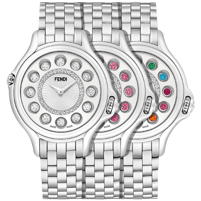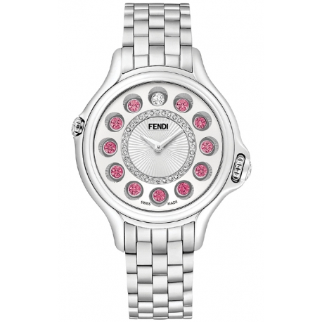 This Fendi Crazy Carats Watch F107034000D2T05 features 38.0 mm case made of stainless steel; silver dial encrusted with 36 white diamonds; gemstone interchange of 33 white, pink and rainbow topazes; stainless steel bracelet with folding closure. The timepiece is equipped with Swiss quartz movement. Unique designer watch for lady.