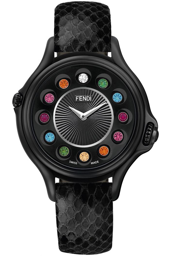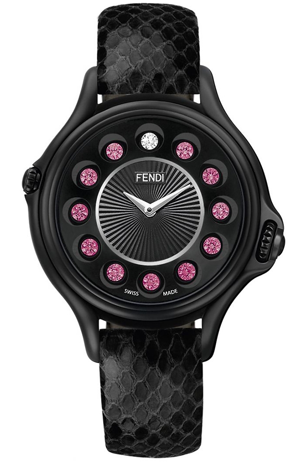 This Fendi Crazy Carats Black Edition women's watch F110031011T05 features 38 mm case professionally created from stainless steel that covered with black PVD. You can easily change gemstone hour markers by turning the crown. They're presented by 1 diamond (0.07 carat) at 12 o'clock position and 33 rainbow, white, pink topazes (2.84 carats). The timepiece has black dial. It comes with genuine black python leather band secured by tang buckle. This is a luxurious designer watch for the sophisticated woman! Also known as 733064000142