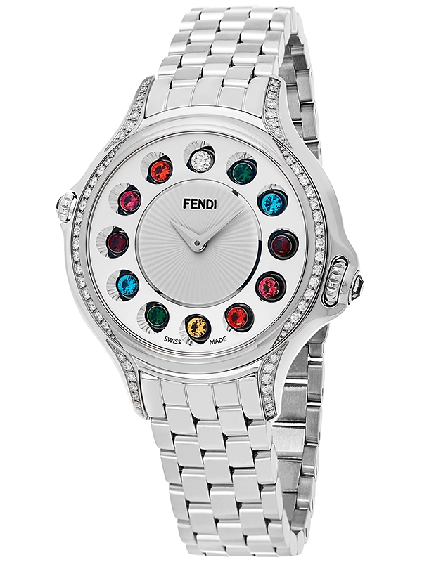 This Fendi Crazy Carats Diamonds women's watch F107024000C0T05 features 33 mm case ably made of stainless steel with highly polished finish. It's encrusted with 54 white diamonds totaling 0.31 carat. You can easily change gemstone hour markers by turning the crown. They're presented by 1 diamond (0.04 carat) at 12 o'clock position and 33 rainbow, white, pink topazes (1.55 carat). The timepiece has silver dial. It comes on stainless steel bracelet secured by folding buckle. This is a chic designer watch for the person who appreciates the highest quality!