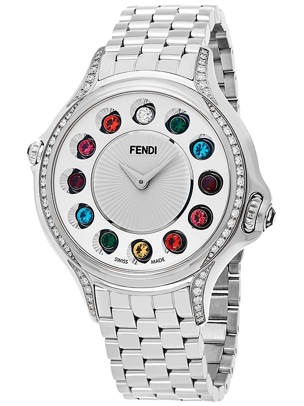 This Fendi Crazy Carats Diamonds women's watch F107034000C0T05 features 38 mm case artfully created from stainless steel with highly polished finish. It's accented with 58 white diamonds totaling 0.50 carat. You can easily change gemstone hour markers by turning the crown. They're presented by 1 diamond (0.07 carat) at 12 o'clock position and 33 rainbow, white, pink topazes (2.84 carats). The timepiece has silver dial. It comes on stainless steel bracelet secured by folding buckle. This is a chic designer watch for the person who appreciates the highest quality!