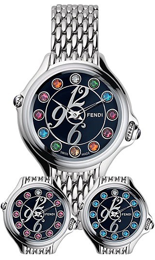 Fendi Crazy Carats Black Dial Steel Bracelet 38 mm Women's Watch - Reference F105031000T02 - According to Fendi, Crazy Carats mechanism is patented, which allows a woman to change the gemstones on her watch simply by turning the crown. Three different settings for three distinctive gemstone color stories, using diamonds, rubies, sapphires and multi-colored topaz.