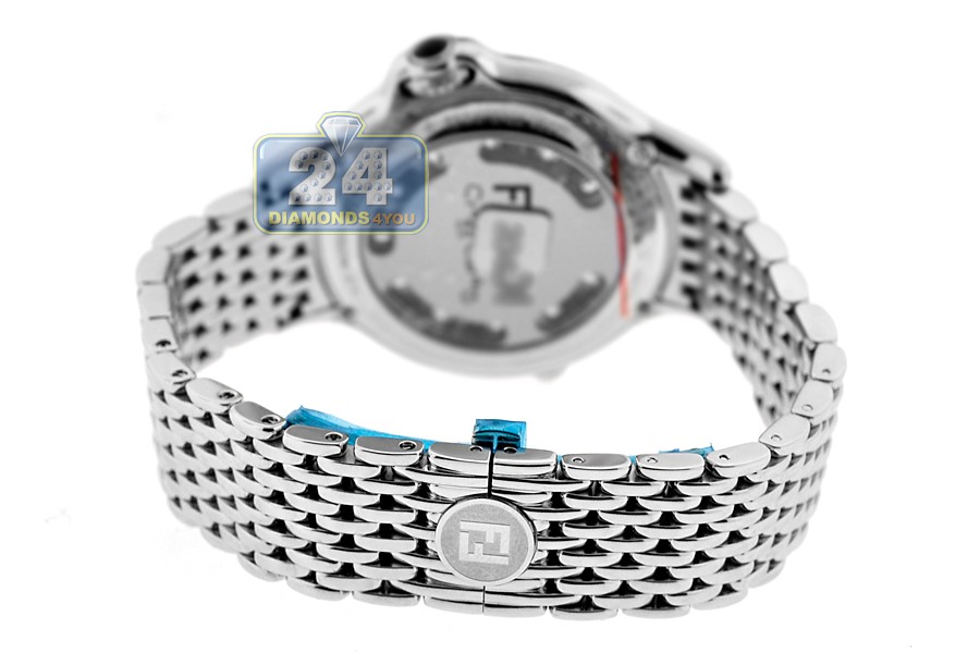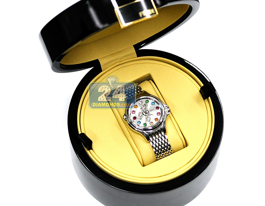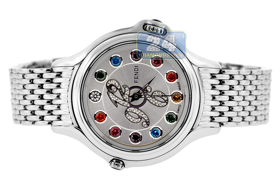 Fendi Crazy Carats Diamond Silver Dial Steel Bracelet 38 mm Women's Watch - Reference F105036000D1T02 - According to Fendi, Crazy Carats mechanism is patented, which allows a woman to change the gemstones on her watch simply by turning the crown. Three different settings for three distinctive gemstone color stories, using diamonds, rubies, sapphires and multi-colored topaz.