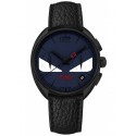 This Momento Fendi Bugs Watch F214613411 features 40.0 mm stainless steel case covered with black PVD; dark blue dial with white eyes; genuine black calfskin leather band with tang buckle closure. The timepiece is equipped with Swiss quartz movement that has chronograph and date functions. Handsome designer watch for men. Also known as FOR295QW5F0QR8