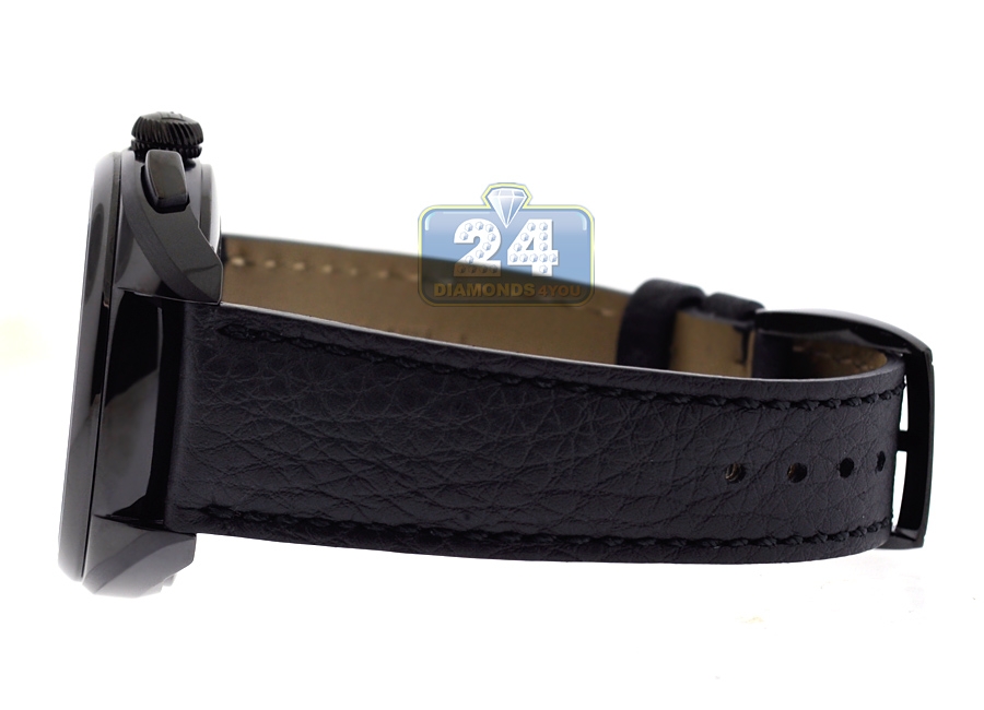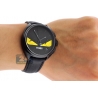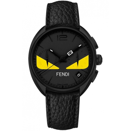 This Momento Fendi Bugs Watch F214611611 features 40.0 mm stainless steel case covered with black PVD; black dial with yellow eyes; genuine black calfskin leather band with tang buckle closure. The timepiece is equipped with Swiss quartz movement that has chronograph and date functions. Stylish designer watch for men. Also known as FOR418QW5F0QT6
