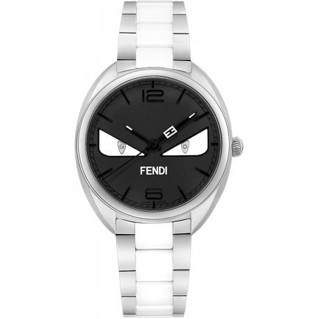 This Momento Fendi Diamond Bugs women's watch F216031104D1 has 34 mm case that is ably made of stainless steel with polished finish. It has black lacquered dial with white luminescent eyes, set with 2 diamonds (0.005 carat), and secured by scratch resistant sapphire crystal. The timepiece is equipped with accurate Swiss made quartz movement. It also features stainless steel bracelet with white ceramic central links. An elegant designer watch for the lady!
