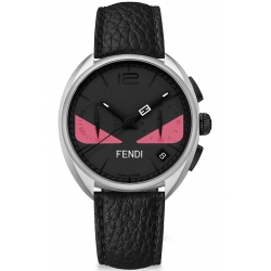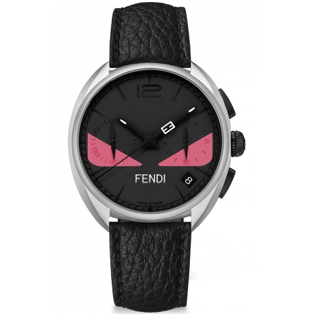 This Momento Fendi Bugs women's / men's watch F214011711 has 40 mm case that is masterly created from stainless steel with polished finish. It has black dial with pink luminescent monster eyes, and secured by scratch resistant sapphire crystal. The timepiece is equipped with accurate Swiss made quartz movement with chronograph and date functions. It also features genuine black calfskin leather band closed with pin buckle. A bright designer watch for the sophisticated person!