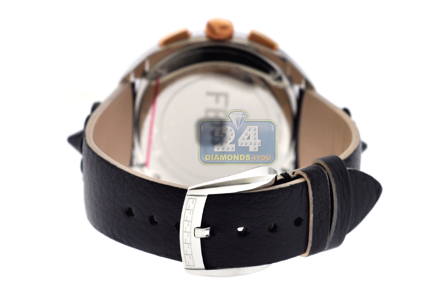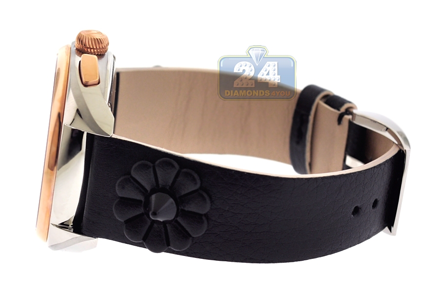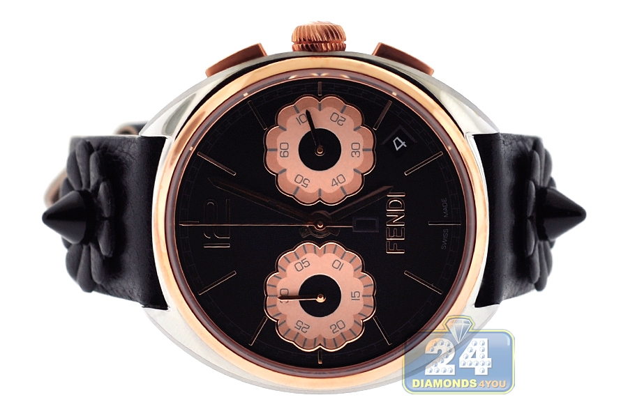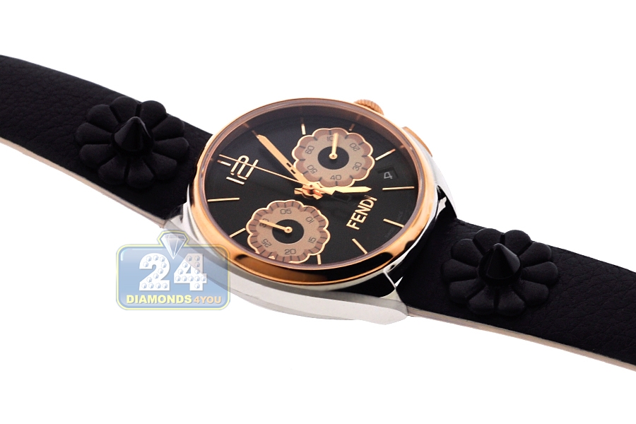 This Fendi Momento Floral chronograph watch F235211411 is a lovely choice for special occasions! Artfully made of polished stainless steel, the case measures 40 mm in diameter. Its bezel as well as crown and buttons are covered with long-lasting rose gold plating that gives dramatic contrast. The dial is colored in black with two blossoming daisies which protected by scratch resistant sapphire crystal glass. This women's designer watch comes on genuine black calf leather strap of 17 mm that adorned with unique sharp studs. The band is closed by a comfortable pin buckle. The stylish timepiece features an accurate Swiss quartz movement with chronograph and date functions. Also known as UPC 733064010509. Brand new and authentic Fendi watch.