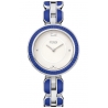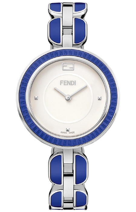 This Fendi My Way Watch F357034003 features 36.0 mm round-shaped case made of stainless steel; white lacquered dial with silver-colored indices; stainless steel with blue ceramic inserts bracelet with jewelry closure. The timepiece is equipped with Swiss quartz movement. It also comes with removable arctic fox fur collar of blue color. Beautiful designer watch for lady.