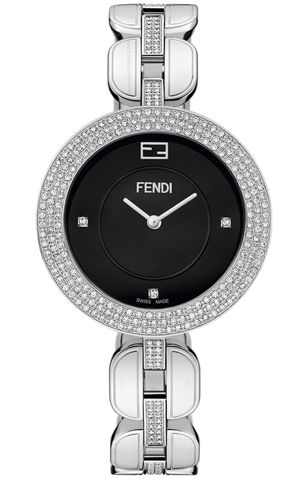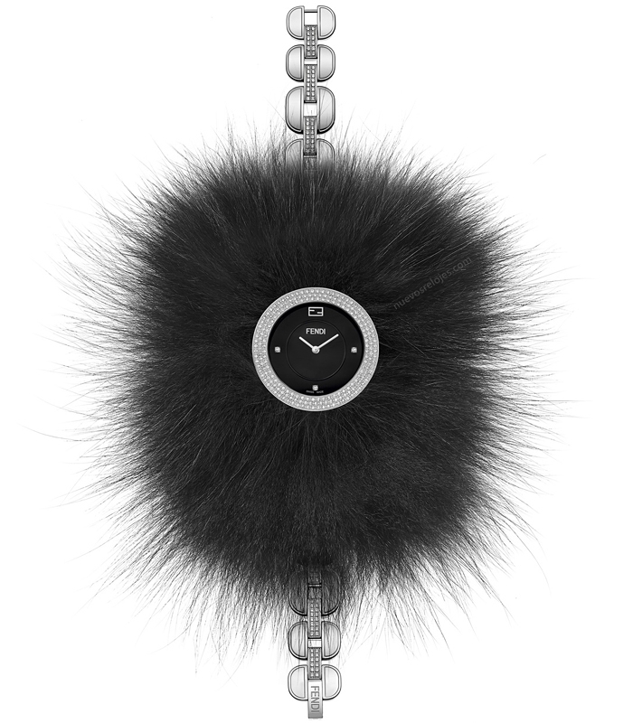 This Fendi My Way Watch F351031000R1 is limited edition of 50 pieces. It features 36.0 mm round-shaped case made of stainless steel; bezel encrusted with 334 diamonds; black lacquered dial accented with 3 diamonds; stainless steel bracelet with links set with 168 diamonds. The timepiece is equipped with Swiss quartz movement. It also comes with removable arctic fox fur collar of black color. Unbelievable designer watch for lady.