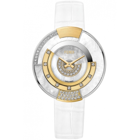 This Fendi Policromia women's watch F511034541H2 features a round-shaped case of 38 mm that is made of stainless steel and 18k yellow gold with polished bevel insert. The bezel has mother-of-pearl inserts. It's also accented with 42 white diamonds of 0.49 carat. There are mother-of-pearl inserts with yellow gold-colored zone (set with 24 diamonds, 0.14 carat) and silver azurage-finished center zone on the dial. It's secured with scratch resistant sapphire crystal. The timepiece is equipped with accurate Swiss quartz movement. It comes on genuine white alligator leather strap closed by pin buckle. Truly magnificent designer watch!