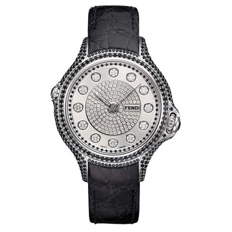 Fendi Precious Pave Crazy Carats Diamond Dial Black Alligator Strap 38 mm Women's Watch - Reference F104031011P4P02 - According to Fendi, Crazy Carats mechanism is patented, which allows a woman to change the gemstones on her watch simply by turning the crown. Three different settings for three distinctive gemstone color stories, using diamonds, rubies, sapphires and multi-colored topaz.