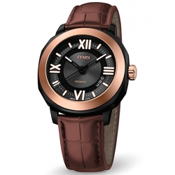 Take a look at this interesting Fendi Selleria Automatic Pink Gold Bezel Watch for Men F820211011 that has case of 42 mm wide. It is professionally produced from stainless steel with 18k rose gold plated bezel. Designer watch for men has circular brushed black dial with white luminescent Roman numerals. It is secured by scratch resistant sapphire crystal. This Fendi watch features high-quality Swiss made automatic movement with 38 hours of power reserve. It also comes with interchangeable bands: brown alligator leather (folding buckle), carbon fiber patterned calfskin leather (pin buckle), and black fabric finished calfskin leather (pin buckle). This is a red carpet worth automatic watch!