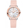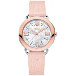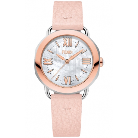 This Fendi Selleria Watch F8032345A7 features 36.0 mm round-shaped case made of stainless steel; rose gold plated steel bezel; white mother-of-pearl dial with rose-colored numerals; interchangeable genuine rose leather band of 17 mm with buckle closure. The timepiece is equipped with Swiss quartz movement. Bright designer watch for lady.