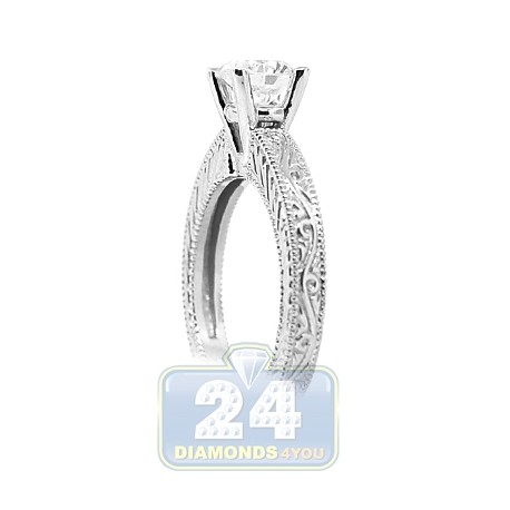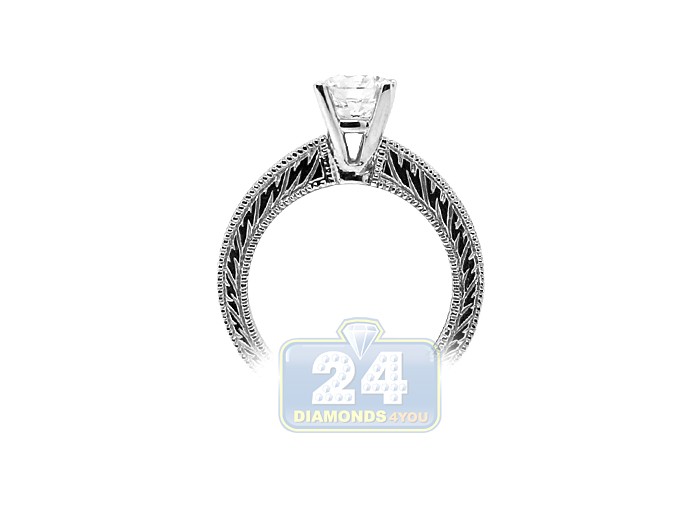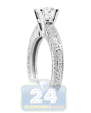 This antique styled engagement ring is surely any woman's dream! The jewel is skillfully detailed with hand engraved shank and features a sparkling round cut diamond of natural origin. The brilliant is 1 carat and has VS2 clarity with I color. The vintage inspired engraving adds a romanticism and epitomizes the glow of your love. Make her feel like a real queen with this stunning bridal ring! GIA Certified.