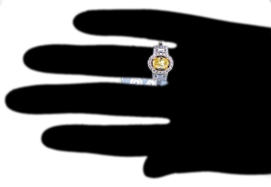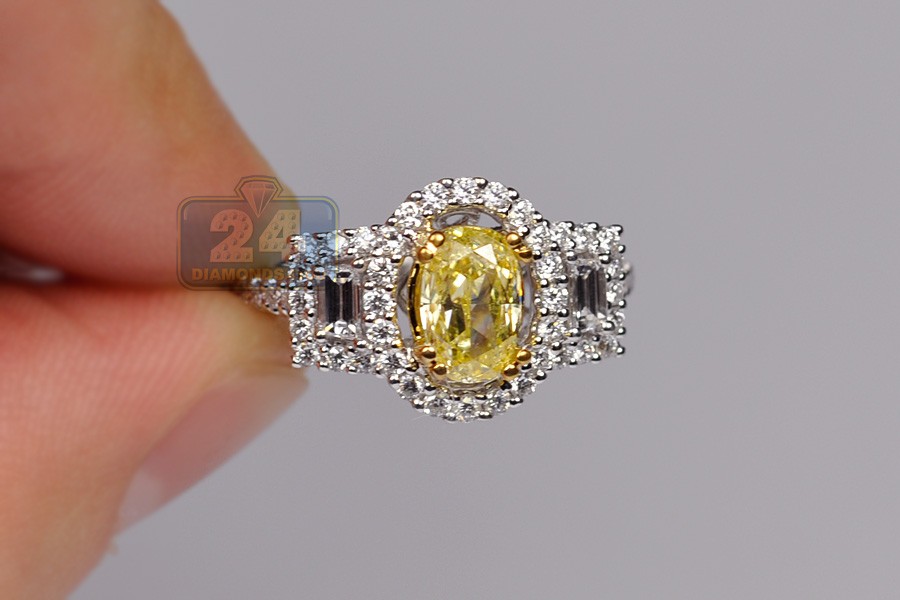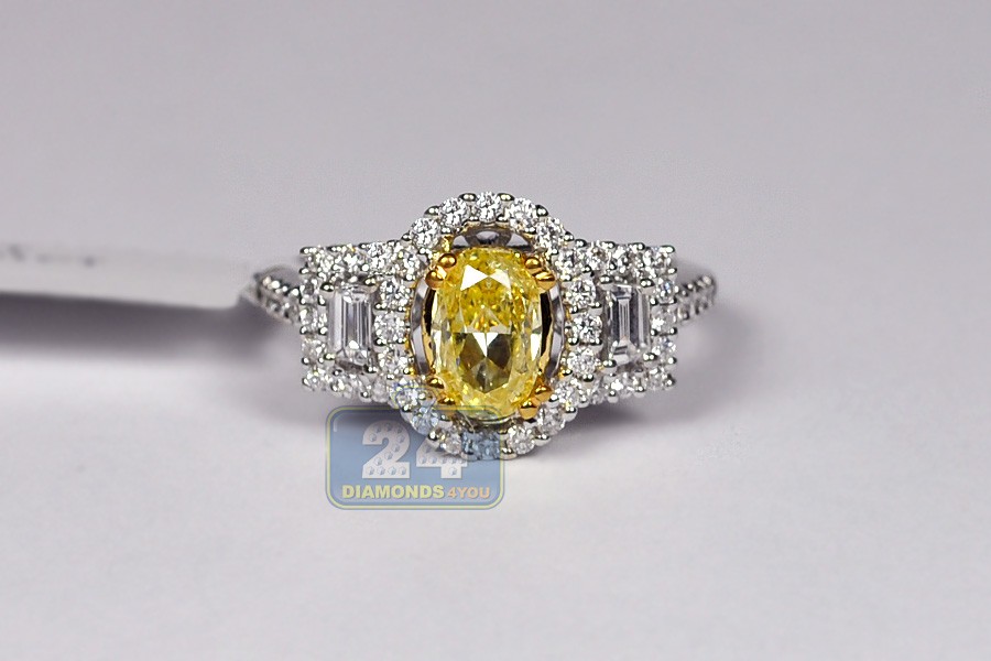 With its rich & sophisticated design, this fancy intense yellow diamond engagement ring is a vision of elegance! The center stone, fancy intense yellow oval-cut diamond, is GIA certified. It is gorgeously surrounded by icy white round- and baguette-cut diamonds to add a special look and feel. What a truly magnificent diamond piece!