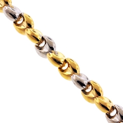 Style: Semi-Hollow Fancy Bullet Chain Metal: 10K Yellow, White Gold Finish: Polished Length / Weight: 30 inches (760 mm) / 42.1 grams 36 inches (910 mm) / 50.7 grams Width: 5/16 inch (8.5 mm) Clasp: Lobster Claw Manufacturer: Italy