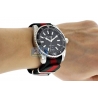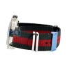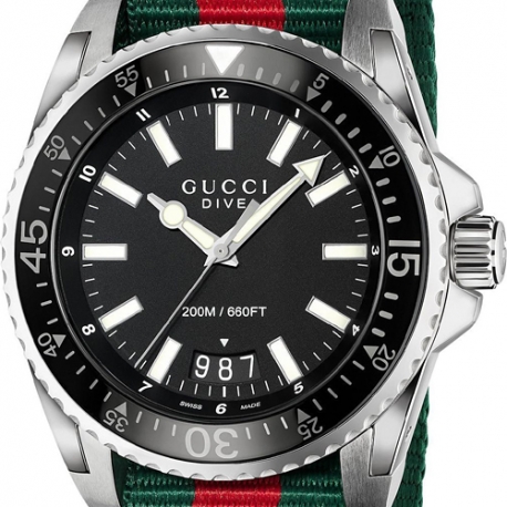 This Gucci YA136206 is designer watch for men, part of Dive collection. It features 45 mm round-shaped case made of stainless steel; unidirectional rotating bezel with black top ring; analog black dial with white hour markers; nylon band of green and red colors; scratch resistant sapphire crystal. The watch is equipped with Swiss quartz movement that has date function. This casual sport timepiece is a great choice!
