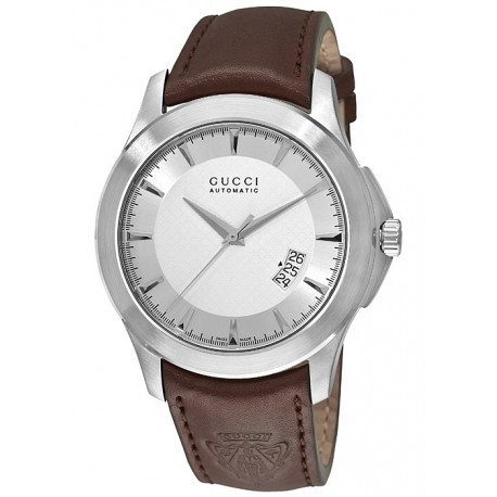 Men's Gucci G-Timeless Collection Swiss Automatic Movement Silver Dial Stainless Steel Case on Brown Leather Strap Watch Reference #YA126216