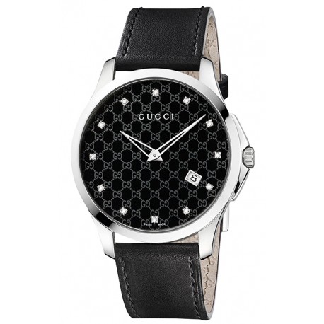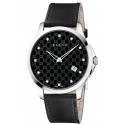 Lady's Gucci G-Timeless Collection Slim Fit Round Shaped Stainless Steel Case on Black Leather Band Diamond Dial Watch Reference #YA126305