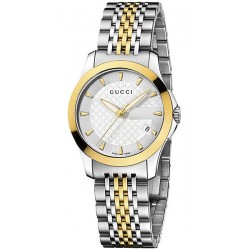 Lady's Gucci G-Timeless Collection Small Sized Mixed Yellow Gold Plated Stainless Steel Case & Bracelet Silver Diamond Pattern Dial Watch Model #YA126511