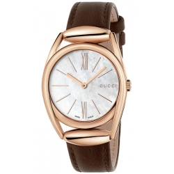 This Gucci Horsebit Lady's Watch YA140507 has tonneau-shaped case made of stainless steel that covered with long-lasting rose gold plating. The dial features white mother-of-pearl color with rose-tone Roman numerals and bar indices. It comes on genuine brown leather strap of 17 mm in width, secured with pin buckle. The timepiece is also equipped with high-quality Swiss quart movement. Amazing designer watch!