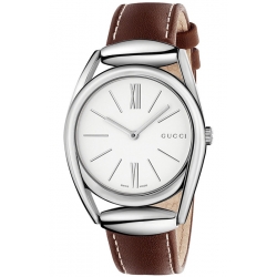 This Gucci Horsebit Lady's Watch YA140402 has tonneau-shaped case made of stainless steel high-polished, smooth and shiny finish. The dial features white lacquered color with silver-tone Roman numerals and bar indices. It comes on genuine brown leather strap of 17 mm in width, secured with pin buckle. The timepiece is also equipped with high-quality Swiss quart movement. Amazing designer watch!