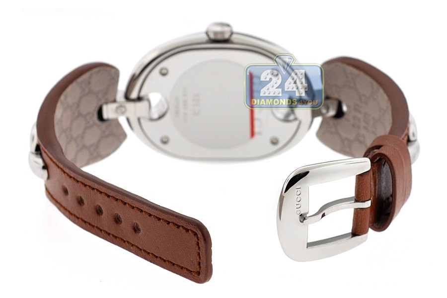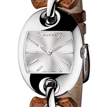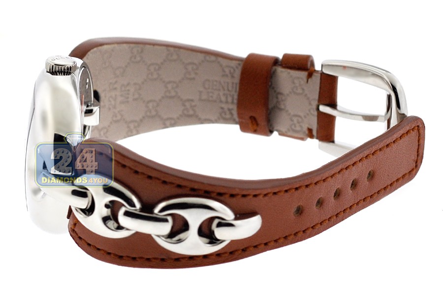 Women's Gucci Marina Chain Series Stainless Steel Case on Brown Leather Strap Silver Dial Swiss Quartz Movement Watch Model #YA121309