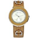 Women's Gucci U-Play Collection Medium Sized Round Shaped Stainless Steel Case on Gold Colored Leather Strap Swiss Quartz Movement Watch Reference #YA129408