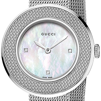 Women's Gucci U-Play Series Small Round Stainless Steel Case & Mesh Bracelet Pearl Diamond Dial Swiss Quartz Movement Watch Reference #YA129517