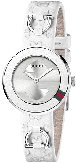 Women's Gucci U-Play Collection Small Sized Round Stainless Steel Case on White Leather Strap Silver Dial Swiss Quartz Movement Watch Model #YA129509