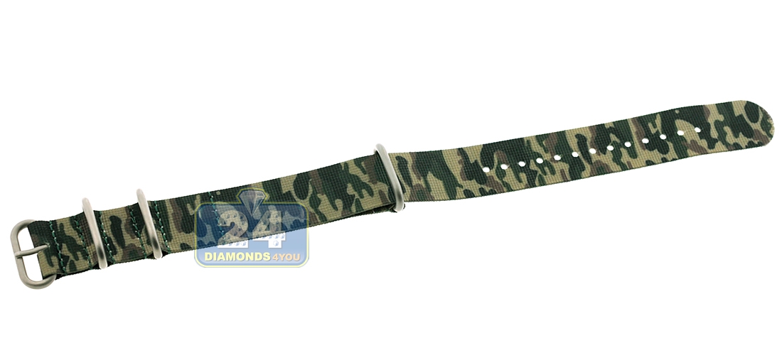 This unique green camouflage one-piece watch band is expertly produced from high-quality nylon by Hadley-Roma. It is available in 18 mm, 20 mm, 22 mm.