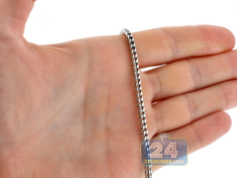 This classic franco link chain is a handsome reflection of your perfect taste! Artfully produced from solid 10 karat white gold in Italy, it has high-polished smooth finish. The white gold chain features 3 mm in thickness, and available in the length of 24, 26, 30, 36 and 40 inches. The weight varies from 30 to 51 grams. The piece is secured by a comfortable lobster clasp. Our men's gold necklace will be a great addition to your jewelry collection!