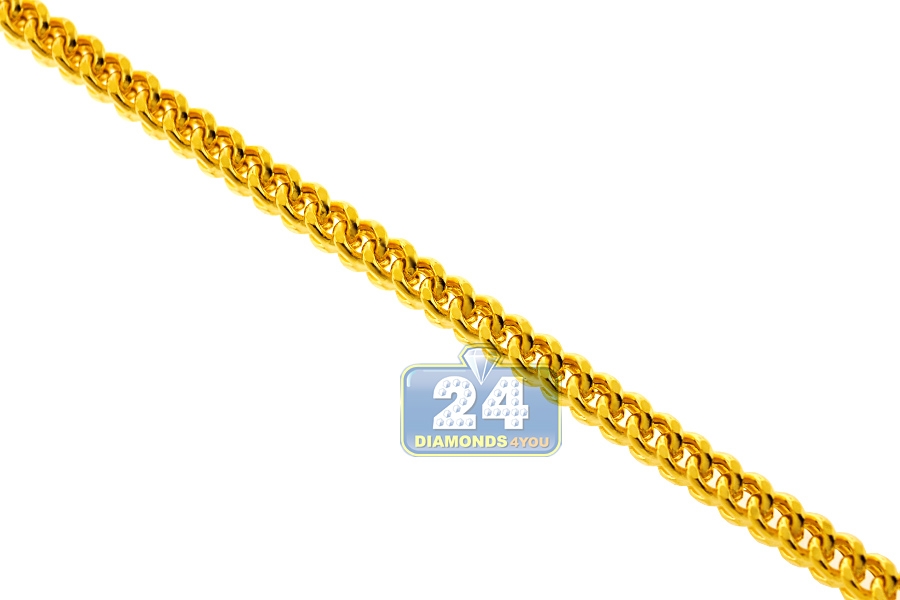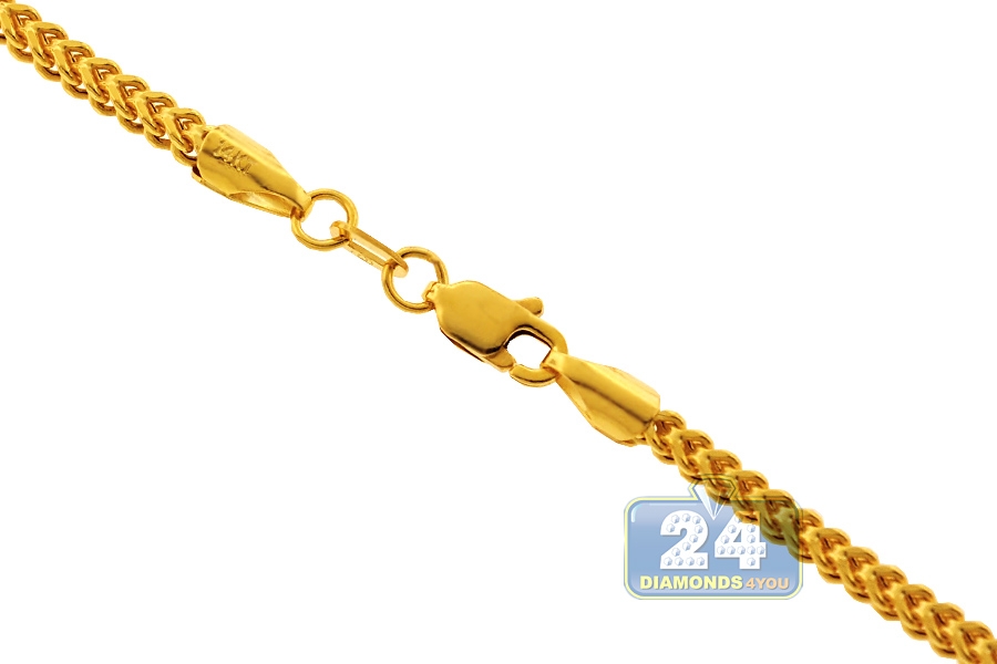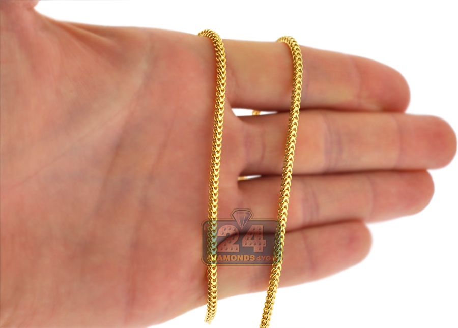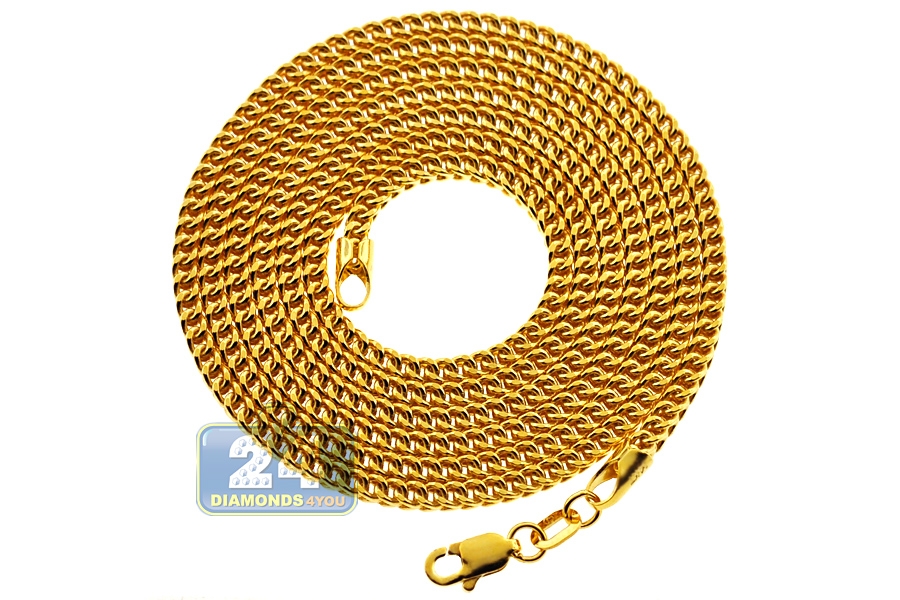 Here's a handsome Franco link chain filled with classic timeless style! It's lovely created from Italian 14k yellow gold, and has high-polished shimmering look. It comes in 20, 22, 24, 26, 28, 30 or 32 inches in length, and measures 2.1 mm in thickness. It's closed with a secure lobster claw clasp. No jewelry collection is complete without this men's gold necklace!