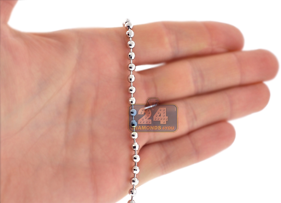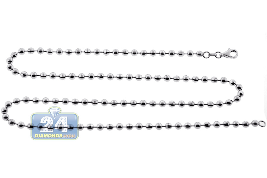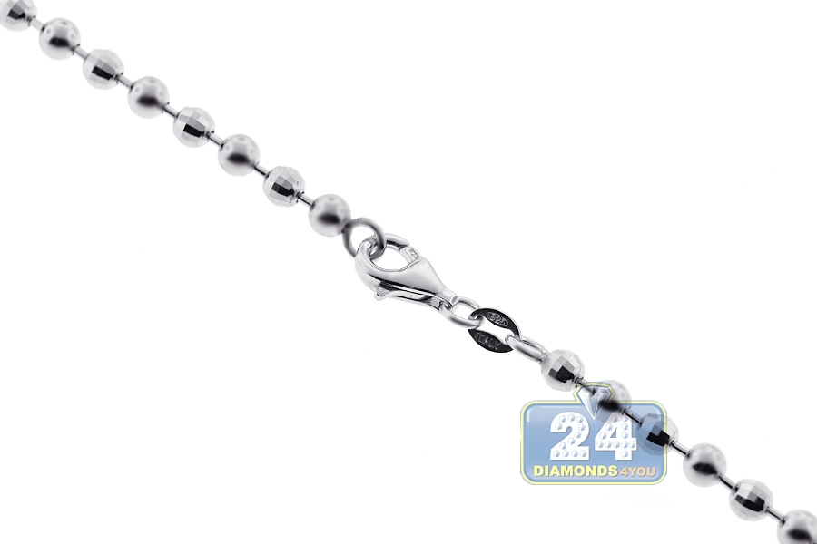 Our army diamond-cut bead chain creates a handsome presentation along the neckline! It is masterly produced from precious 925 sterling silver, and covered with white rhodium that helps prevent tarnishing and gives a bright color. The chain measures 4 mm in width, 22-36 inches in length; and also secures with a safe lobster claw clasp. A unique design featuring an interchange of smooth and diamond-cut beads makes this necklace sparkle a lot. Striking piece of jewelry for your chain collection!
