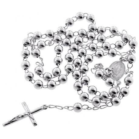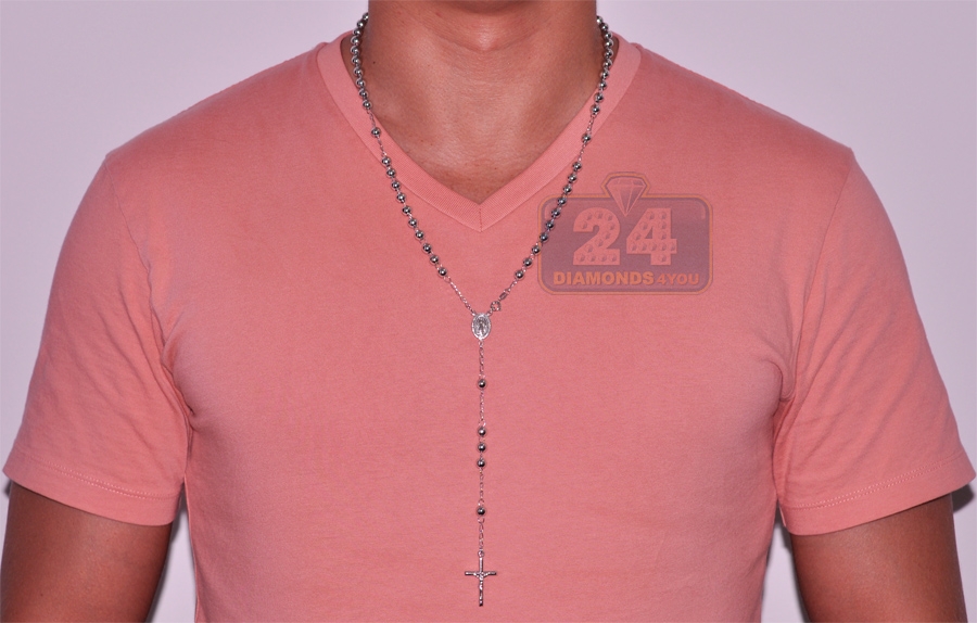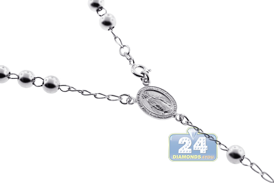 Our handsome rosary necklace is a stunning way to proclaim your faith! It is expertly handmade of lustrous 925 sterling silver, and covered with white rhodium that helps prevent tarnishing and gives a bright color. The piece of jewelry measures 24 inches in length (not including a dangling part) and 6 mm beads. This religious necklace is a timeless accessory that looks unique anytime!