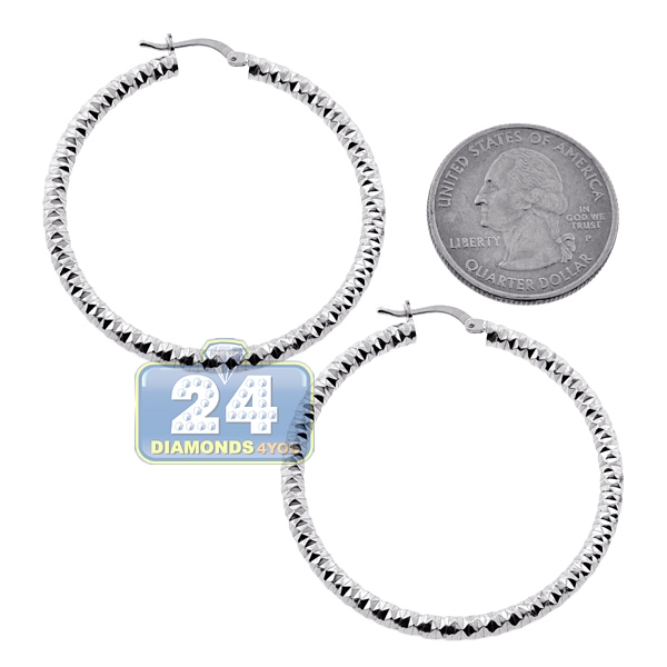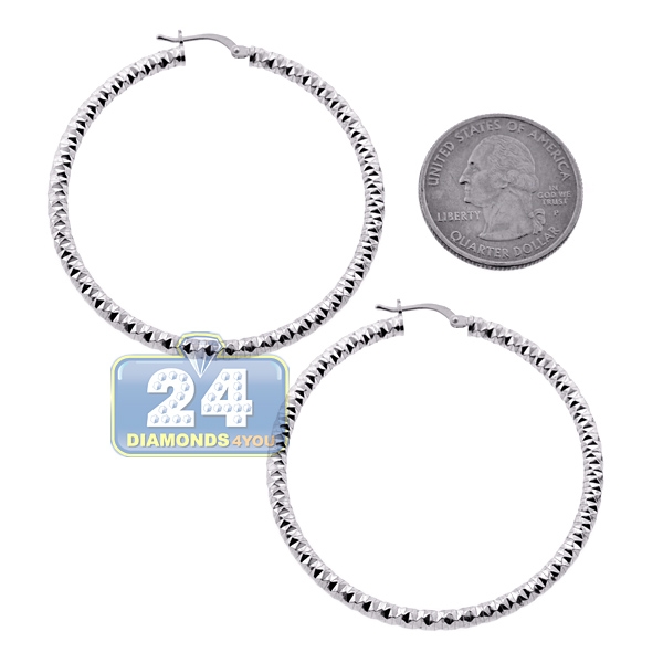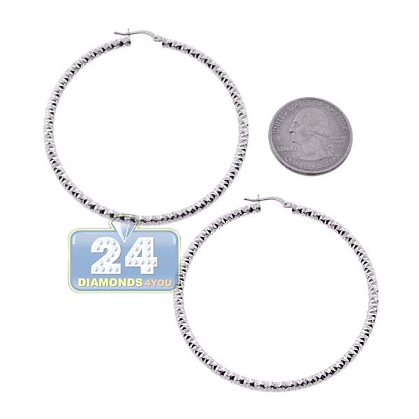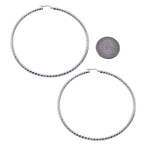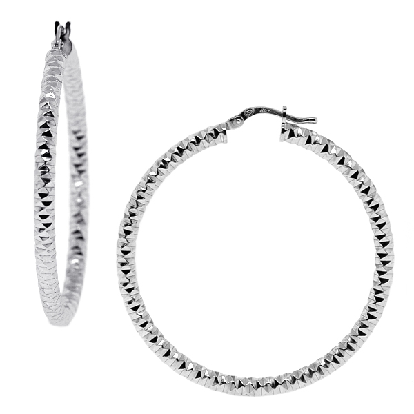 Our round diamond-cut hoops are absolute bliss for lovers of brilliance! They are expertly made of precious 925 sterling silver, and covered with white rhodium that helps prevent tarnishing and gives a bright color. The pair of earrings also features diamond-cut design for extra sparkle, measures 3 mm in width, and secures with a safe post clasp. The pair is available in many sizes including, 3/4 inch, 1 inch, 1.25 inches, 1.75 inches, 2 inches, 2.275 inches, 2.625 inches or 3 inches. These gorgeous hoop earrings are just perfect for your next special event!