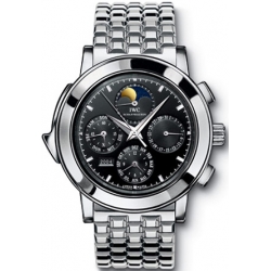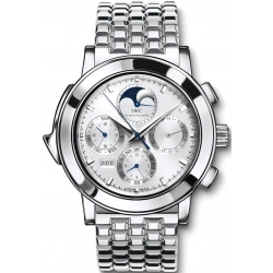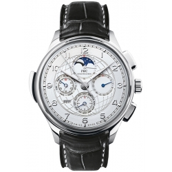 This IWC Portuguese Grande Complication Watch IW377401 is limited and numbered edition of 100 pieces per year worldwide. Case is made of solid platinum, and has brushed and polished finish. It is equipped with high-quality automatic movement (caliber 79091, 657 parts, 75 jewels) with power reserve of 44 hours. Chronograph function features 30-minute counter sub-dial at 12 o'clock, and 12-hour counter sub-dial at 6 o'clock. Perpetual calendar features week day showed on outside perimeter of sub-dial at 9 o'clock; date located at sub-dial at 3 o'clock; month showed on outside perimeter of sub-dial at 6 o'clock; current year window located between 7 and 8 o'clock. Moonphase is displayed at sub-dial at 12 o'clock position. Case back of this timepiece is engraved with year of production and limited edition number for that year.