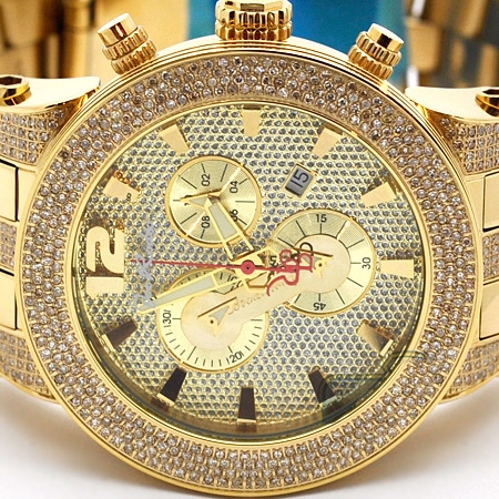 Look at this gorgeous diamond watch for men by Joe Rodeo JRBR12 from Broadway collection. It features yellow gold plated stainless steel case, bracelet and bezel that encrusted with genuine white diamonds totaling 5.00 carats. The watch also has pave dial with yellow sub-dials, and comes with two extra straps of different colors. For accurate time, it is equipped with high-quality Swiss quartz movement that has chronograph and date functions. 24diamonds.com is official dealer of Joe Rodeo, so you will get 1-year factory warranty and professional after-warranty service. Please check the video below for more details.
