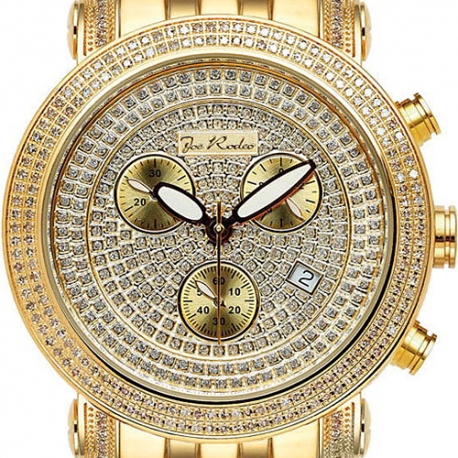 Breathtaking men's diamond watch by Joe Rodeo JCL19 from Classic collection. It features yellow pave dial with three sub-dials, yellow gold plated stainless steel case, and diamond bezel encrusted with natural white diamonds totaling 1.75 carat. The watch has stainless steel bracelet, and also comes with two extra bands of different colors. For accurate time, it is equipped with high-quality Swiss quartz movement with chronograph and date functions. 24diamonds.com is official dealer of Joe Rodeo, so you will get 1-year factory warranty and professional after-warranty service.