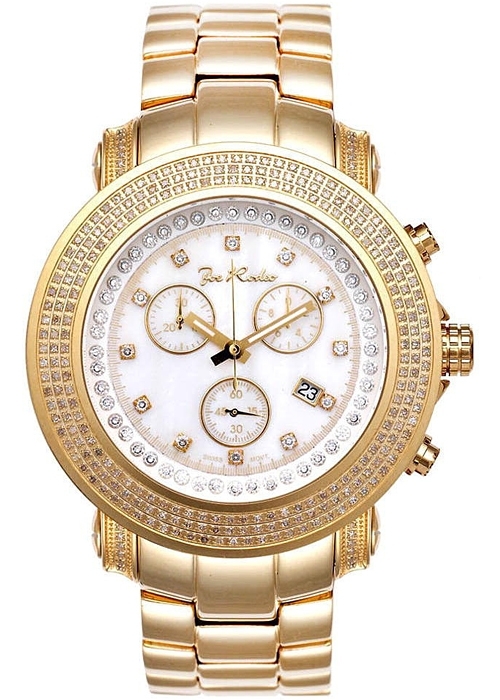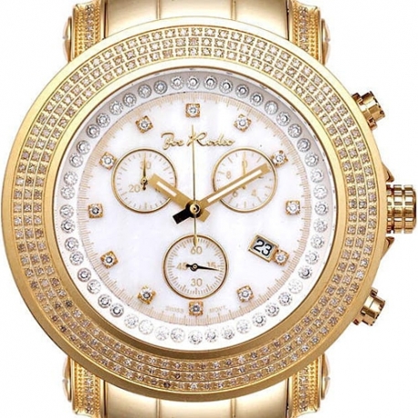 Make a handsome statement wearing this magnificent diamond watch for men by Joe Rodeo JJU3 from the most well-known Junior collection. It has yellow gold plated stainless steel case, bracelet and bezel that encrusted with three rows of genuine white diamonds totaling 2.50 carats. The watch features white mother-of-pearl dial, and comes with two extra straps of different colors. For accurate time, it is equipped with reliable Swiss quartz movement that has chronograph and date functions. 24diamonds.com is official dealer of Joe Rodeo, so you will get 1-year factory warranty and professional after-warranty service.