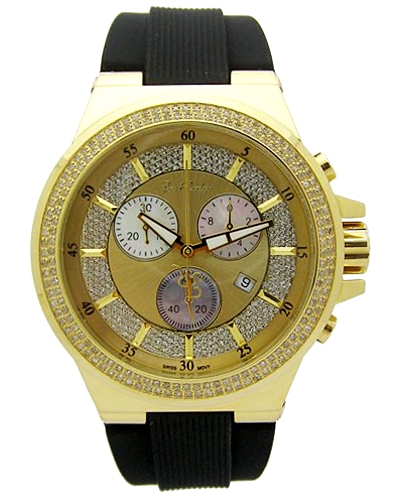 This Joe Rodeo Liberty Diamond Watch JRLI1 is a part of newly designed collection. The case is made of stainless steel, and covered with long-lasting yellow gold plating. Its bezel is encrusted with two rows of genuine diamonds totaling 1.50 carat. The yellow-colored dial features three mother-of-pearl sub-dials. The watch has black silicone band with pin buckle, and comes with two extra straps. It is equipped with Swiss quartz movement that has chronograph and date functions. Statement making piece for everyday wear!