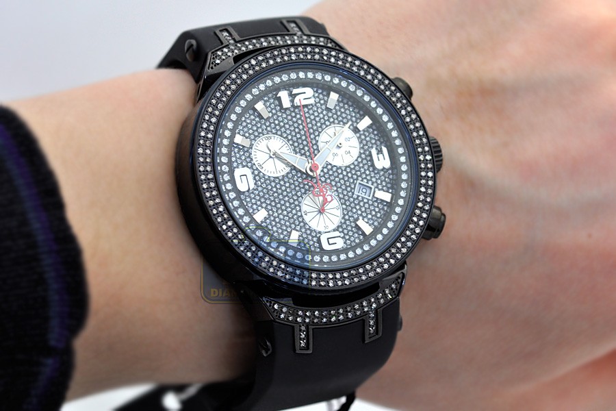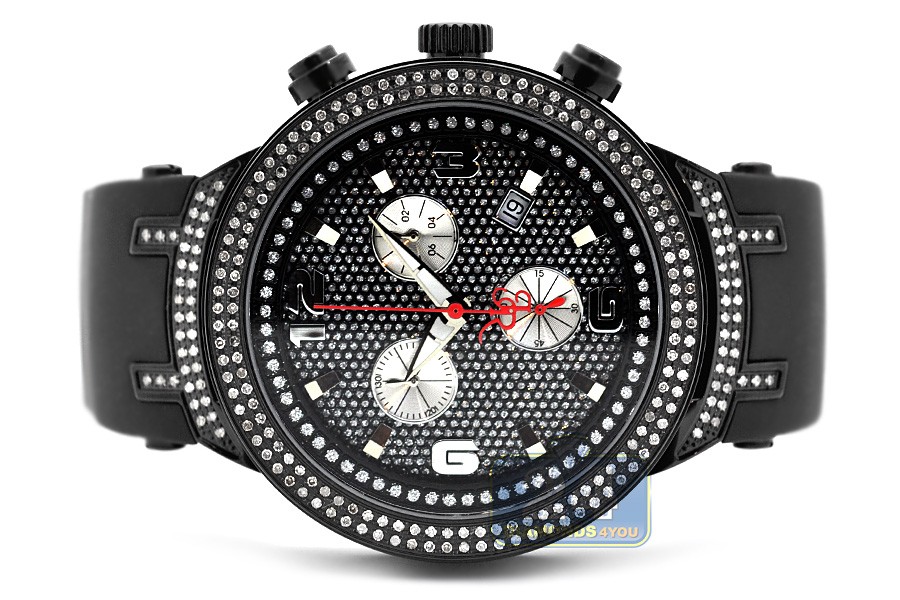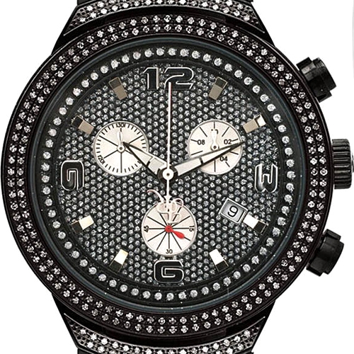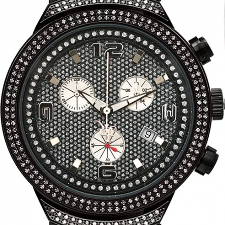 Make a bold statement with this men's diamond watch JJM90 from Master series styled by Joe Rodeo of New York. The case is created from durable stainless steel covered with long-lasting black PVD. The bezel is set with two rows of natural white diamonds, all totaling 2.20 carats. The watch has black dial with pave imitation pattern, black rubber strap and two extra straps of different colors. For accurate time, it is equipped with reliable Swiss quartz movement that has chronograph and date functions. 24diamonds.com is official dealer of Joe Rodeo, so you will get 1-year factory warranty and professional after-warranty service.