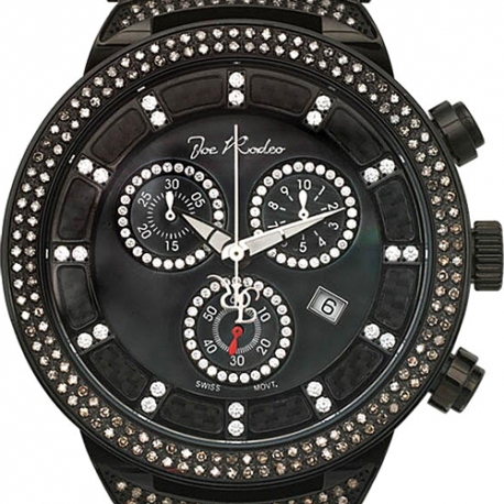 High-fashion men's diamond watch JJM77 from well-known Master collection styled by Joe Rodeo of New York. The case and bracelet are produced from durable stainless steel covered with long-lasting black PVD. And they're amazed with genuine white diamonds, all totaling 4.75 carats. The black mother-of-pearl dial with three sub-dials is secured by scratch resistant mineral crystal. This timepiece also comes two extra straps of various colors. It is equipped with Swiss quartz movement featured date and chronograph functions. Truly handsome look for a special occasion!